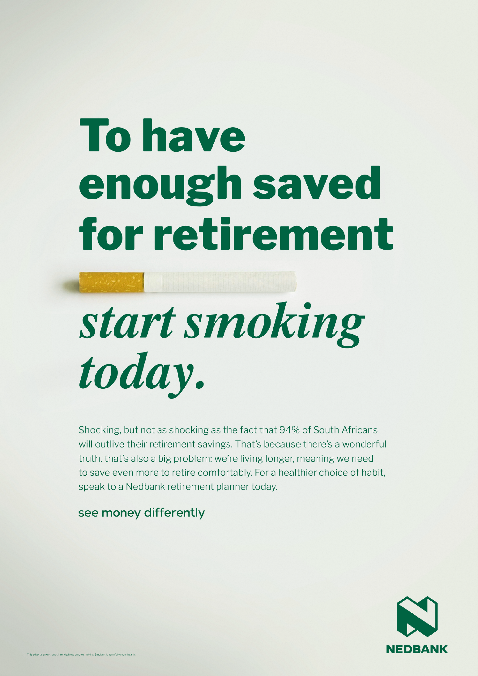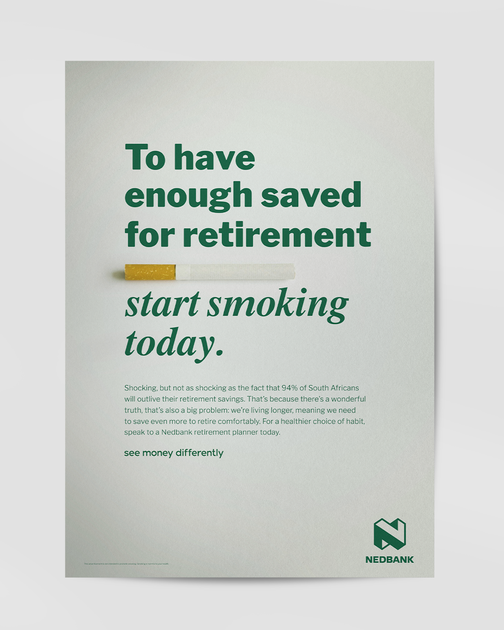 As the bank whose purpose is to use their financial expertise to do good, we wanted to warn our target market, help change their savings behaviour and increase consideration of Nedbank during Savings Month in July. But with South Africans ignoring the plethora of same-same messages from banks, we had to be provocative. With cigarette advertising banned 24 years ago, we knew a bank print ad showcasing a cigarette and a headline that encourages smoking would be guaranteed to stand out, as well as create enough intrigue to read our important message and impart a feeling of